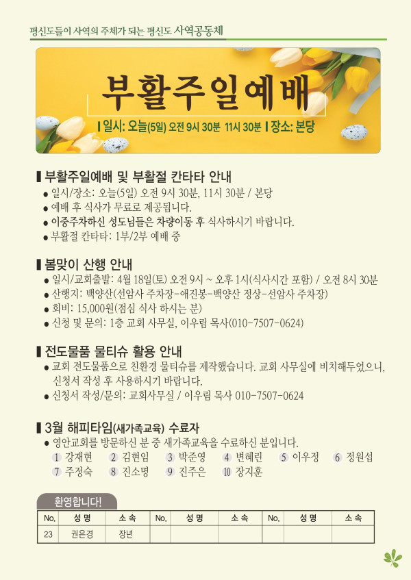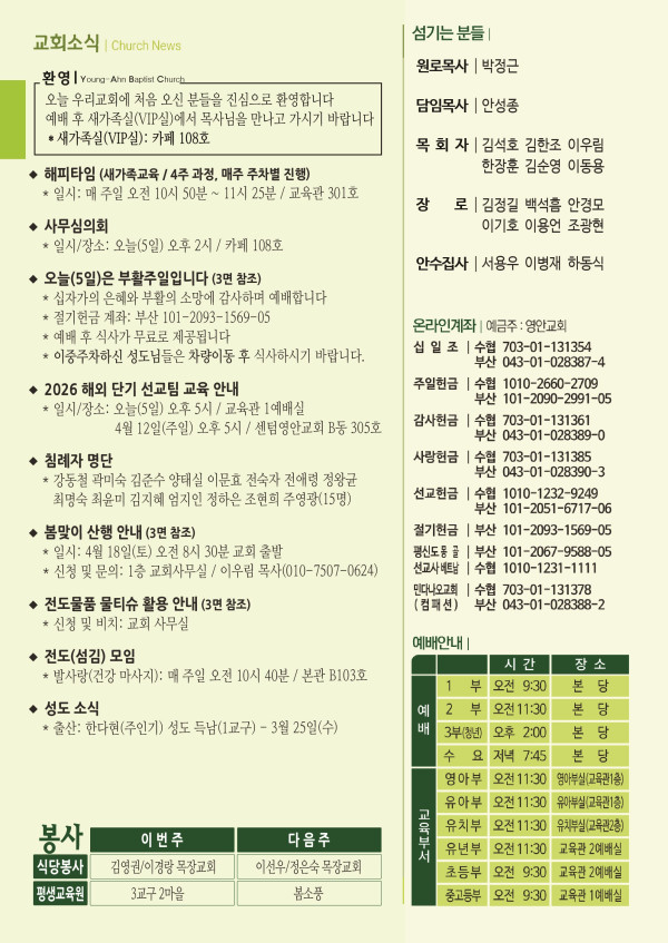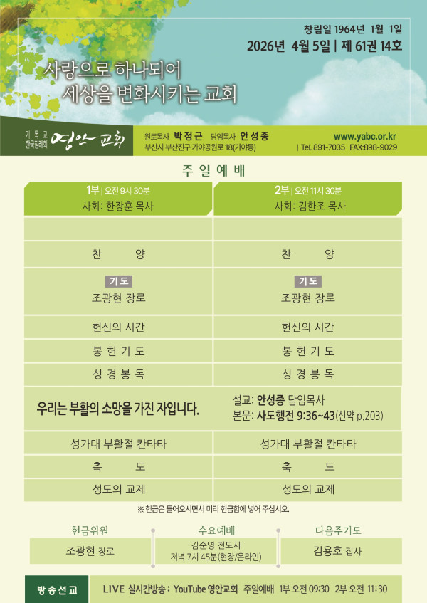 2026년 4월 5일 주보 페이지 정보 작성자 관리지기 작성일26-04-04 10:18 조회630회 댓글0건 관련링크 목록 본문 2026년 4월 5일 주보 댓글목록 등록된 댓글이 없습니다. 목록